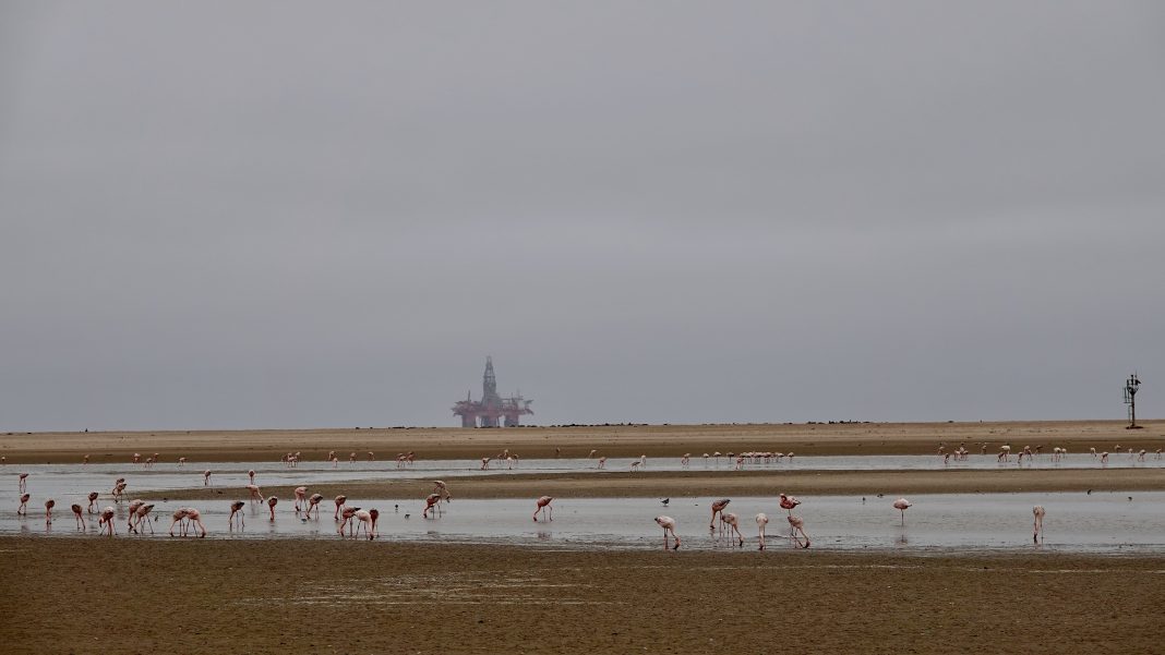 Contrasting context: Flamingos forage along Namibia’s fragile coastline as an offshore oil rig looms on the horizon — a stark image of the high-stakes struggle between ecological preservation and the political, legal and technical battles shaping the future of the Orange Basin’s oil and gas boom. Photo: John Grobler